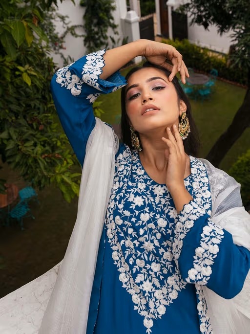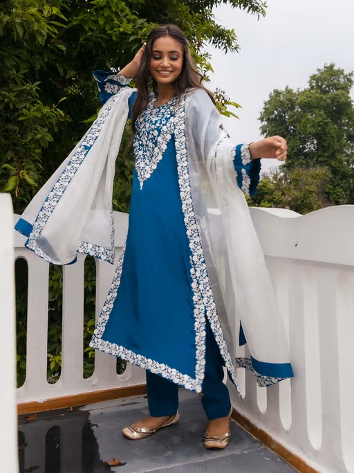 Teal blue crepe kurta embellished with resham work paired with pants and kota dupatta.