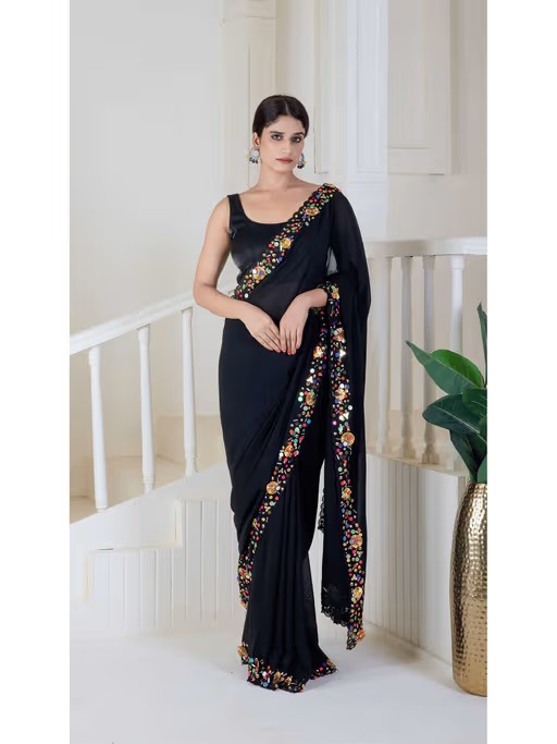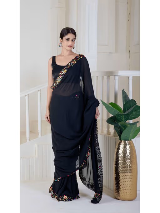 The Black Pure Georgette Saree Is A Stunning Piece That Exudes Elegance And Sophistication. Its Fabric Flows Gracefully, Providing A Perfect Drape. Adorned With Intricate, Multi-Coloured Embroidery, The Saree Showcases A Vibrant Tapestry Of Designs That Catch The Eye. The Embroidery Features A Blend Of Different Elements, Adding A Touch Of Modern Flair While Honouring Traditional Craftsmanship