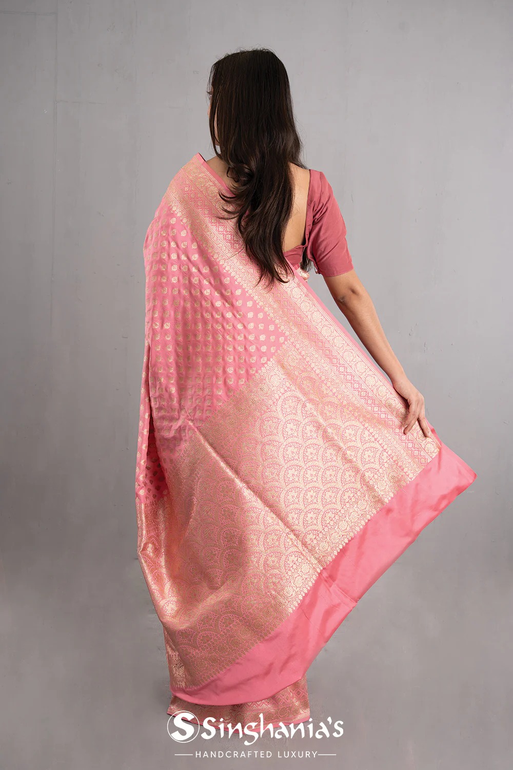 This carnation pink banarasi silk saree is a vision of elegance. Features delicate floral butti motifs woven in golden zari, beautifully accentuated by floral vine design that adorns the small border and the striking pallu. The silk and details combine to create a special feel.