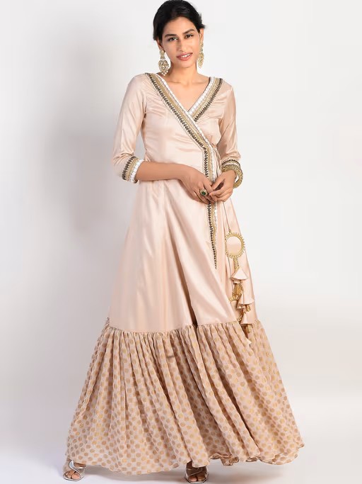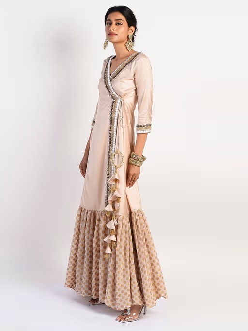 Make an impressive fashion statement with these designer collections from the house of Rishi & Vibhuti. Featuring a peach paper silk angrakha with an intricate embellishment of beads and stones at the borders enhanced with fabric tassels. Pair it with circular hoop earrings and heels to create a statement look for gatherings or an exceptional celebration.