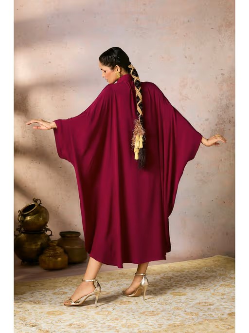Burgundy Foil Print Kaftan Dress with Slip (Set of 2)