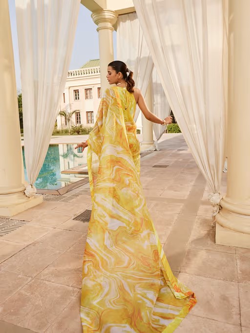 Summer dressing is made easy with this yellow dress sari that comes with a dupatta and a dress. Elevated with hand moti embroidery in organza and pleated linen satin fabrics, the attire has a festive outlook all over!
