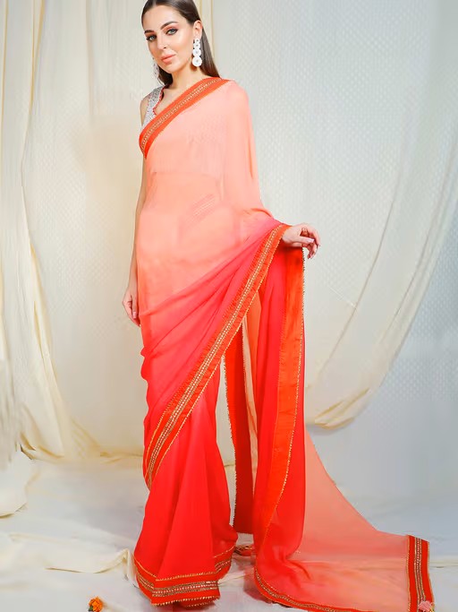 This festive season, illuminate the venue with your presence in Nikasha's ombre salmon to coral gajari chiffon saree with abla border. The outfit is beautifully embellished, you can add some bling to the outfit by pairing it with studded jewellery and footwear.This product can be customised to your requirements for size or colour. Please use the Nykaa Fashion App, and click on the whatsapp icon to get in touch with our customisation experts to place your order.