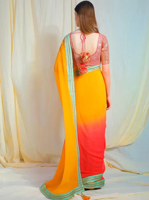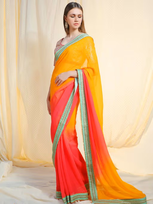 This festive season, illuminate the venue with your presence in Nikasha's ombre haldi & coral gajari chiffon saree with pista abla border. The outfit is beautifully embellished, you can add some bling to the outfit by pairing it with studded jewellery and footwear.This product can be customised to your requirements for size or colour. Please use the Nykaa Fashion App, and click on the whatsapp icon to get in touch with our customisation experts to place your order.