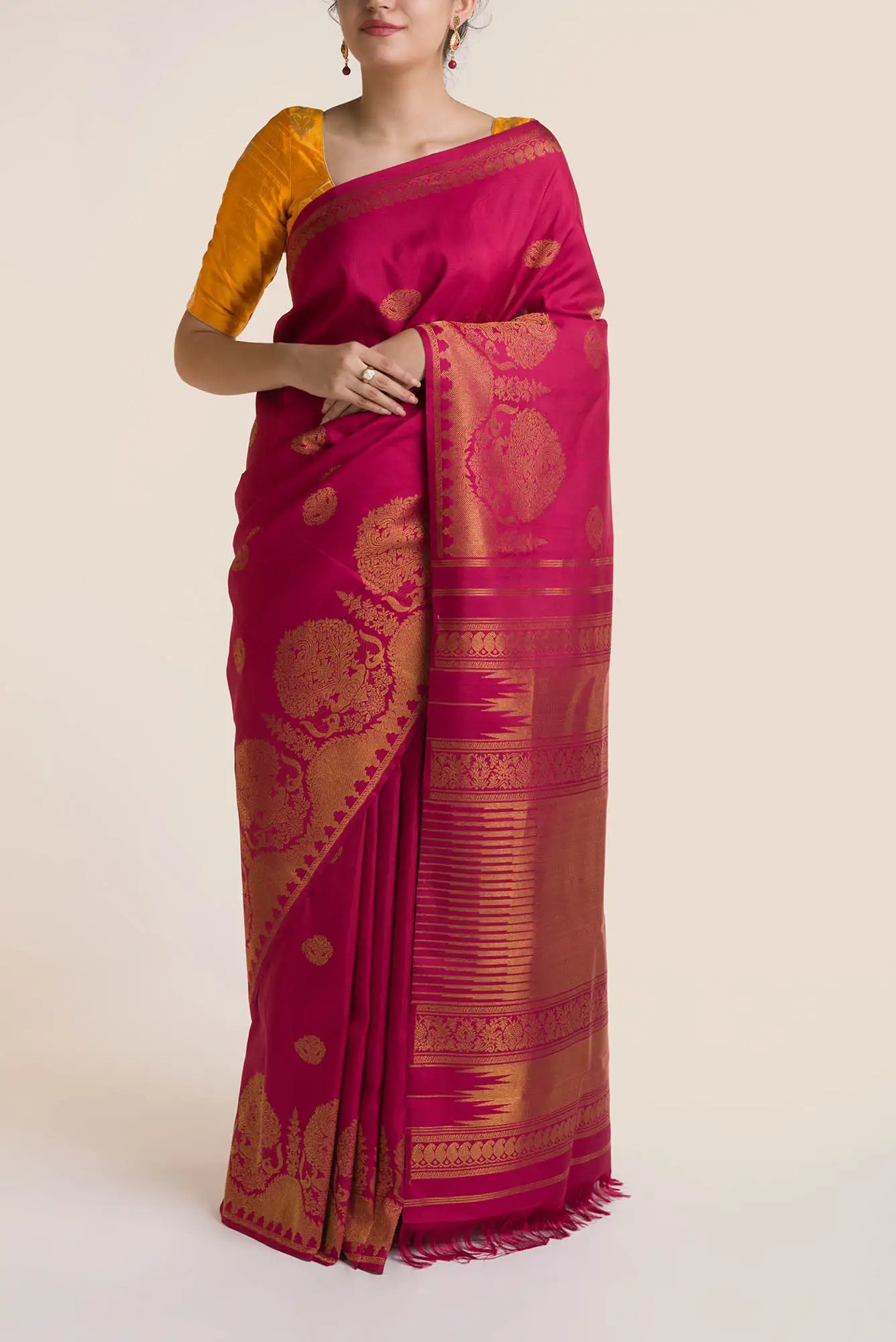 Our 'Gandaberunda' design Kanchipuram silk saree takes about 165 handloom weaving hours to make. Handcrafted in four-ply yarn for a fine drape, and in pure silk to suit auspicious occasions, the saree is an ode to the two-headed bird Narasimha. Gandaberunda patterns adorn the body while the border is adorned with kalash, peacocks, and manga motifs. The blouse worn by the model is not included.