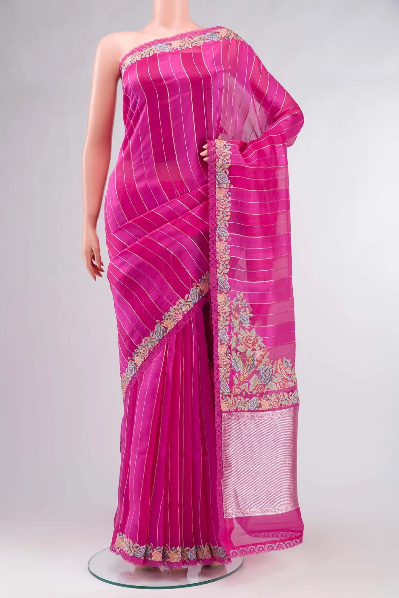 Pink Organza Silk Saree with Zari Butta on the body and Embroidery Border. Includes unstitched blouse.
