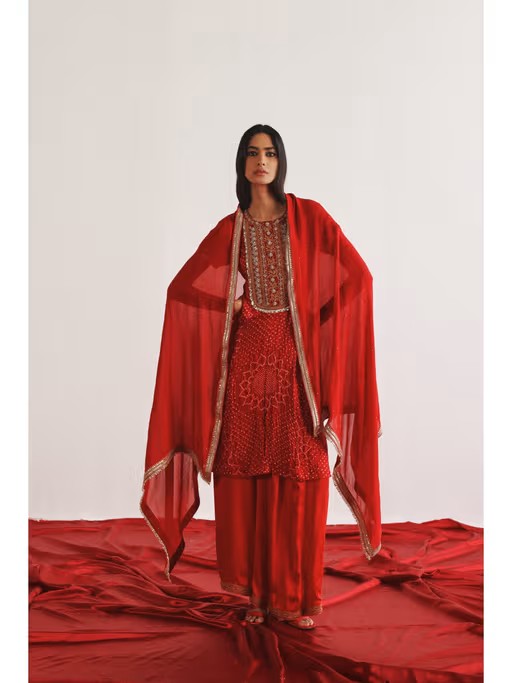 Effortlessly stylish, this Twenty Nine's red maro iwork crushed bandhani kurta with palazzos and dupatta blends classic charm with modern ease. It is crafted from high-quality fabirc. It features half sleeves and round neck style. It's the epitome of understated elegance, perfect for festive, wedding, or special occasions.