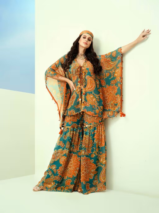 Blue Printed Organza Kaftan Sharara Pant Bustier