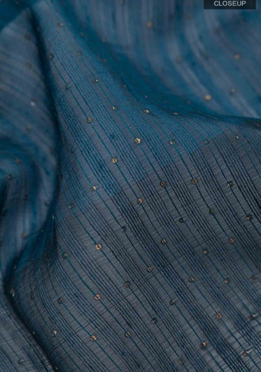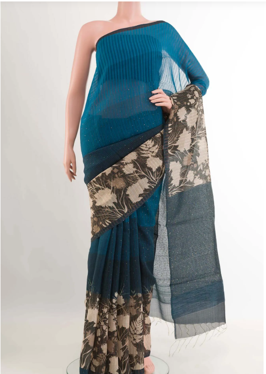 Blue Saree with Stripes on the body and Printed Border. Includes unstitched blouse.