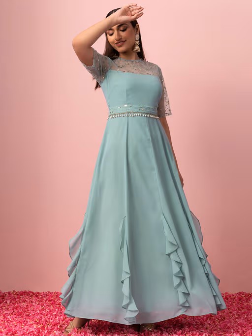 Elevate your look by stepping out in this captivating pastel green sequin embroidered anarkali dress with embroidered belt from Indya. Made from high-quality georgette, this piece features half sleeves and a round neck. Style it with minimal jewellery and sandals to complete the ensemble.