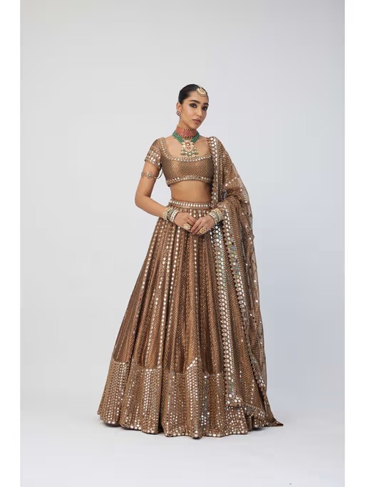 Copper Shimmer Organza Lehenga And Dupatta Clubbed With Real Hand Cut Mirror Embroidered Blouse