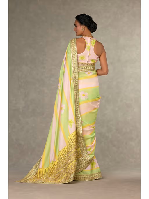 Saree - Leheriya inspired digital printed saree | Palla embroidered with signature Anar and Trikone borders in dori, sitara and moti kaam Blouse piece- Parijat printed blouse piece with embellished borders