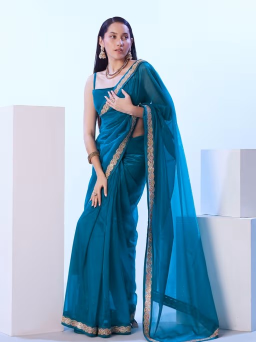 Wrap In Pure Bliss With This Blue Saree, Unstitched Blouse From Odette. Made From High Quality Net, It Features Embellished/Sequined Pattern. Pair It With Flats And Minimal Jewellery To Complete Your Ensemble.