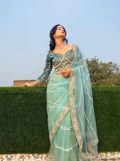 Step into grace with this JATRIQQ Pista Net Embroidery Work Saree with Moti Hand Work Unstitched Blouse with Unstitched. JATRIQQ ethnic sarees come with a blouse piece, which can be stitched according to your taste and preference, with this beautiful design and fabric, this saree will fetch you oodles of compliments and praise.