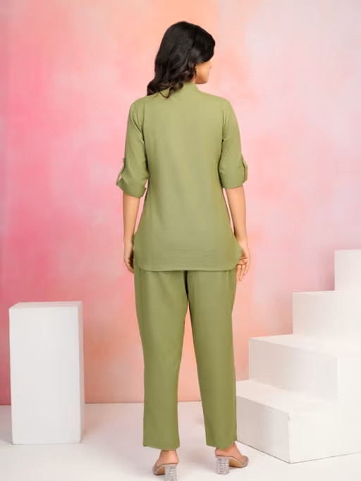Parrot green mandarin collar V neck with big stitched buttons with short sleeve co-ord set in cotton flex. A stylish and comfortable co-ord set featuring a perfectly matched top and bottom, designed for effortless elegance and versatility. Ideal for casual outings or dressed-up occasions.