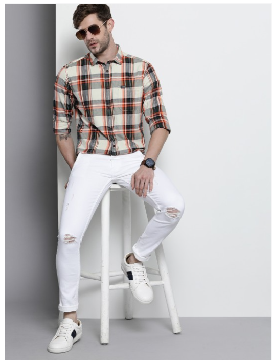 Cream-coloured tartan checks checked opaque Casual shirt ,has a spread collar, button placket, 1 patch pocket, long regular sleeves, curved hem
