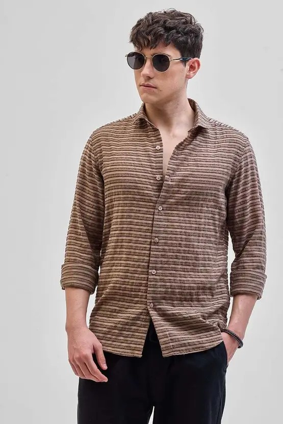 Men Slim Fit Striped Spread Collar Casual Shirt