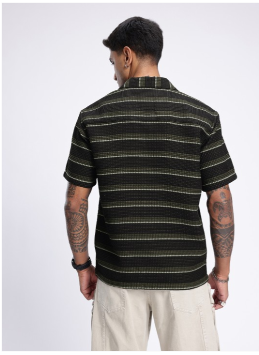 Elevate your street style with the Street Savvy Striped Waffle Textured Shirt. Combining the timeless appeal of bold stripes with the unique waffle texture, this shirt is perfect for those who want to stand out effortlessly. Add it to your wardrobe, and let your style do the talking. Color: Black Neckline: Cuban Collar Sleeve Styling: Short Closure: Button