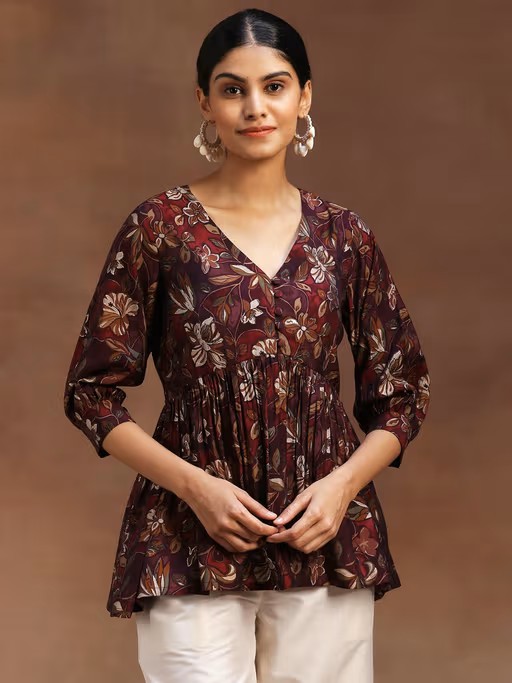 Keep it ethnic and stylish with this burgundy kurti from Libas. Made from high quality silk blend, it features pull on closure and floral pattern along with three fourth sleeves & v-neck design. Pair it with ethnic footwear with bottoms of your choice to complete your ensemble.