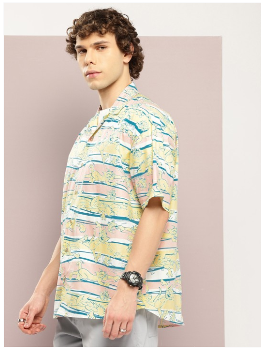 Pink, beige & blue Tom & Jerry graphic printed opaque casual shirt, features a Cuban collar, button placket, short drop-shoulder sleeves, and a curved hem.