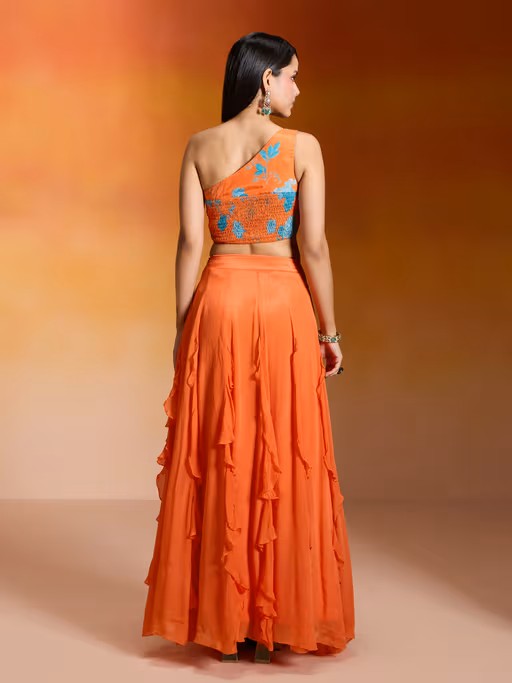Embellishment - One shoulder Floral Printed and Embroidered Seamless padded blouse