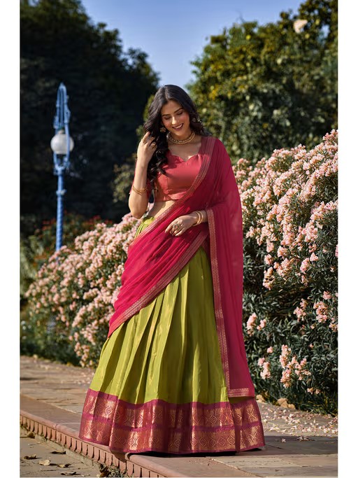 Stitch your style with this free size lehenga set from LooknBook Art. Made from high quality kanjeevaram, it features looknbook-art-green-woven-stitched-lehenga-with-unstitched-blouse-and-dupatta-set-of-3 closure and 1 pattern along with block after info column & use config design. Pair it with minimal jewellery to complete your ensemble.