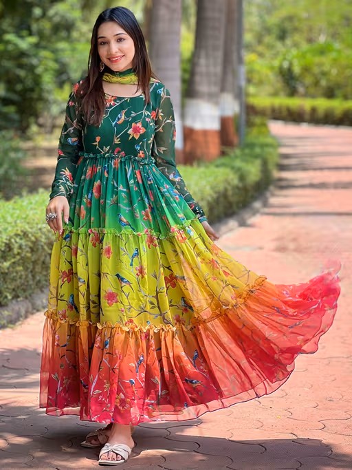 This dress seamlessly combines the elegance of Georgette fabric with the timeless beauty of floral prints and full-length sleeves that provide a graceful and refined appearance. Round Neck a classic and comfortable neckline that complements the overall design.The addition of a coordinating dupatta and practical features like a back zip and padding make it a versatile and stylish choice for any wardrobe.