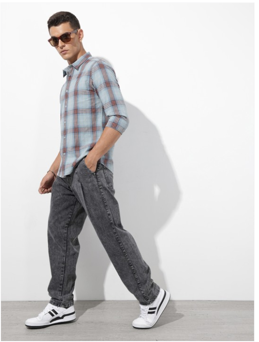 Blue & rust coloured checked opaque casual shirt, has a spread collar, button placket, long regular sleeves, curved hem
