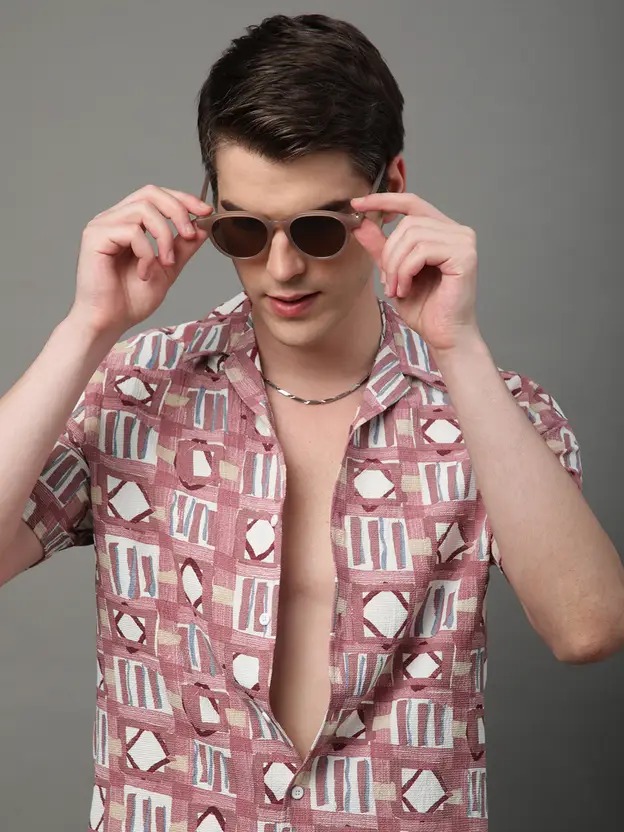Peach Printed casual shirt, has a cuban collar, button placket, no pocket, half sleeves, curved hem, loose fit shirt, smooth and breathable fabric