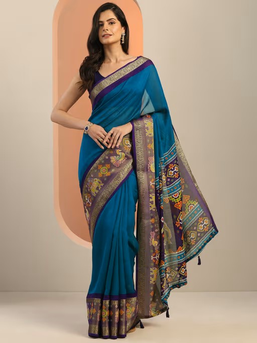 Our Teal Printed Georgette Saree Features Captivating Woven Design Print. Complemented With A Unstitched Blouse Piece. This Charming Saree Is Perfect For Festive Wear.