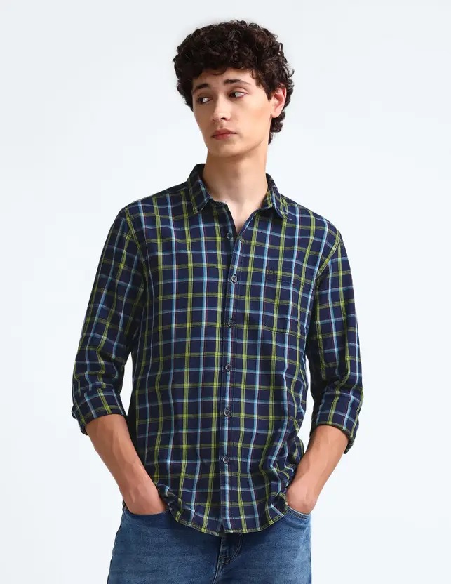 Men Slim Fit Checkered Spread Collar Casual Shirt