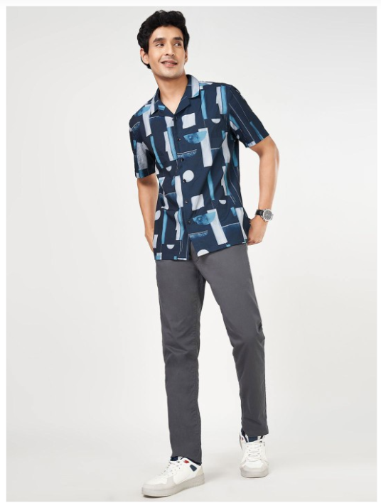 Blue geometric solid opaque Casual shirt ,has a spread collar, button placket, na pocket, short regular sleeves, curved hem