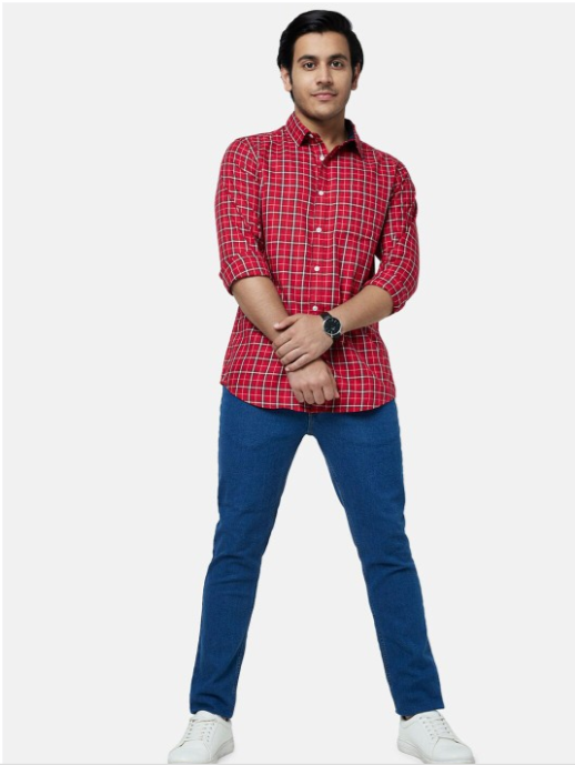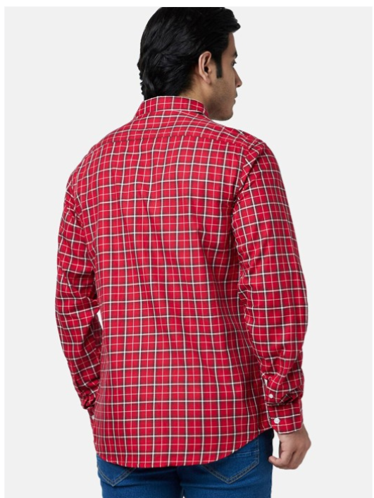 Red and white checked opaque Casual shirt ,has a spread collar, button placket, 1 patch pocket, long regular sleeves, curved hem