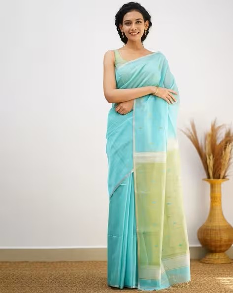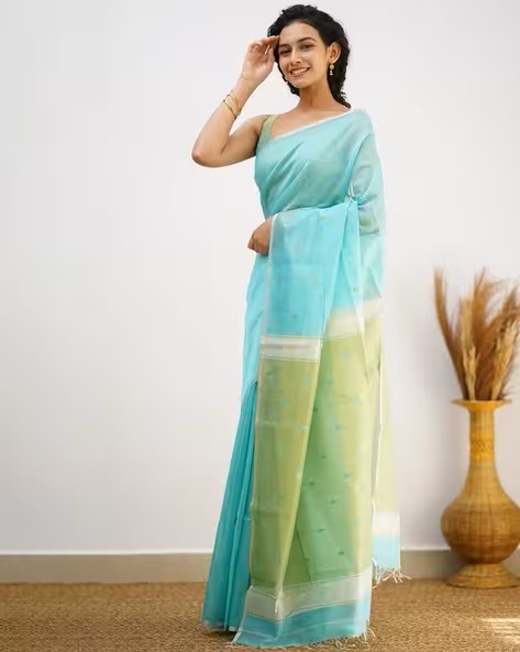 The last image gives a detailed look of the blouse piece that comes with this saree (The model is wearing a blouse from our in-house wardrobe)