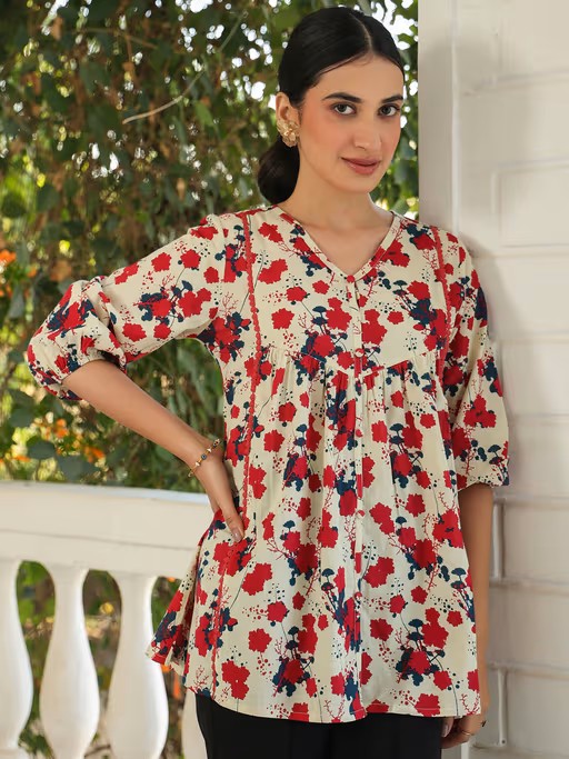 Upgrade Your Casual Wardrobe with This Beige Pure Cotton Floral Printed A-Line Top. Featuring A Chic V-Neck and Playful Balloon Sleeves, It Showcases Multi-Colored Floral Prints for A Vibrant Touch. The Button Ornamentation with A Hook Fly Closure and Parallel Lace Inserts Add Elegance, While Gathers Below The Bust Ensure A Flattering Fit. Pair It with Your Favorite Bottoms for A Stylish Day Out!