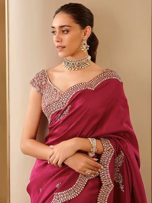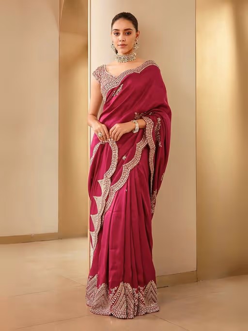 Maroon Silk Blend Embellished Saree with Unstitched Blouse