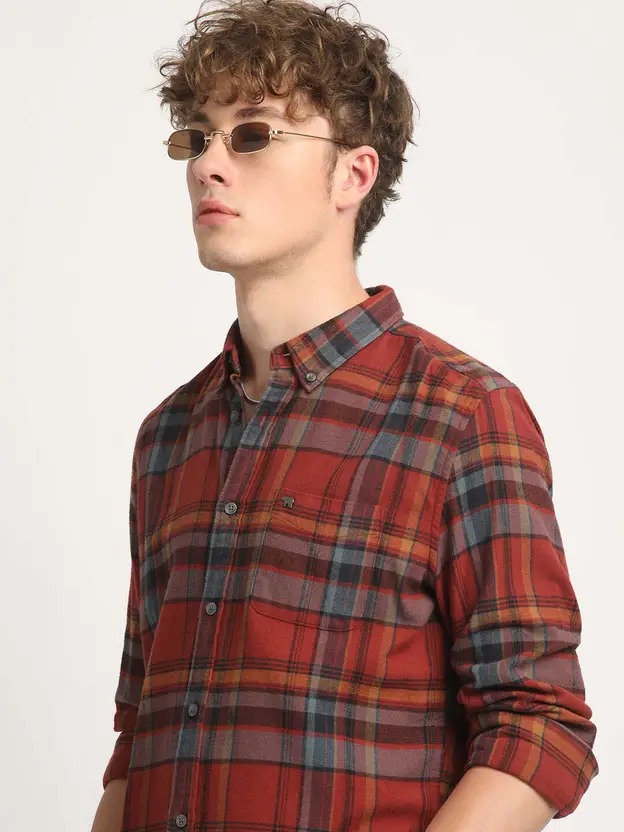 Men Slim Fit Checkered Button Down Collar Casual Shirt