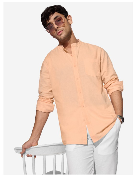 Peach-coloured solid opaque Casual shirt ,has a mandarin collar, button placket, 1 patch pocket, long regular sleeves, curved hem