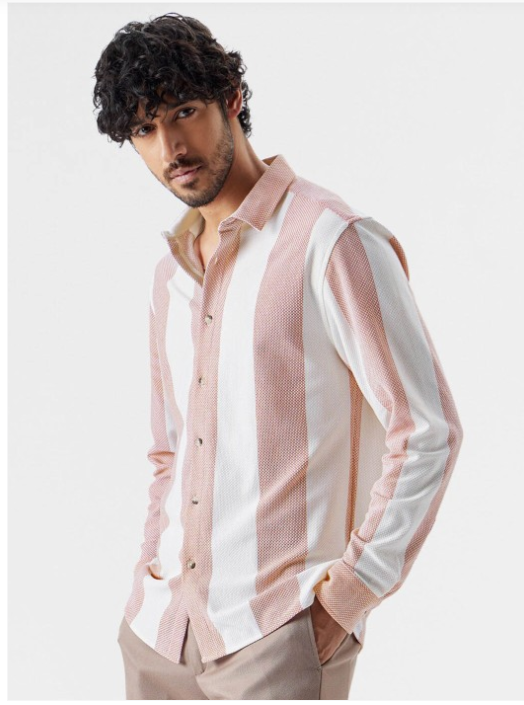 Peach, white vertical striped opaque Casual shirt ,has a spread collar, button placket, long regular sleeves, curved hem