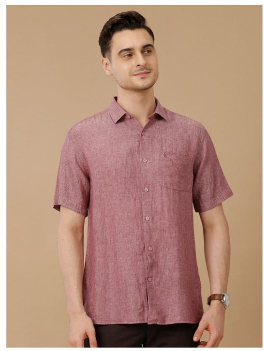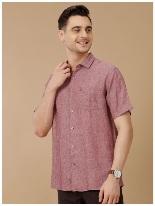 Red solid opaque casual shirt, has a spread collar, button placket, 1 patch pocket, short regular sleeves, curved hem
