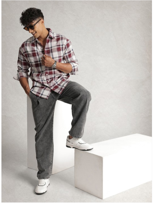 White & maroon checked opaque casual shirt, has a spread collar, button placket, 2 patch pocket, long drop-shoulder sleeves, curved hem